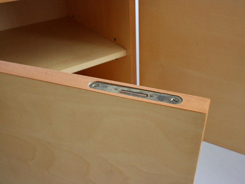 This sideboard (model 251 Stettin) has 4 drawers and 3 doors. The lock sits on the upside of the door (see pictueres). This is very unique! The credenza has another specific characteristic: The door in the center can be opened up to 180°. Marked.