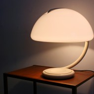 A table lamp with a real futuristic look. It has a pivoting metal arm with an acrylate shade.