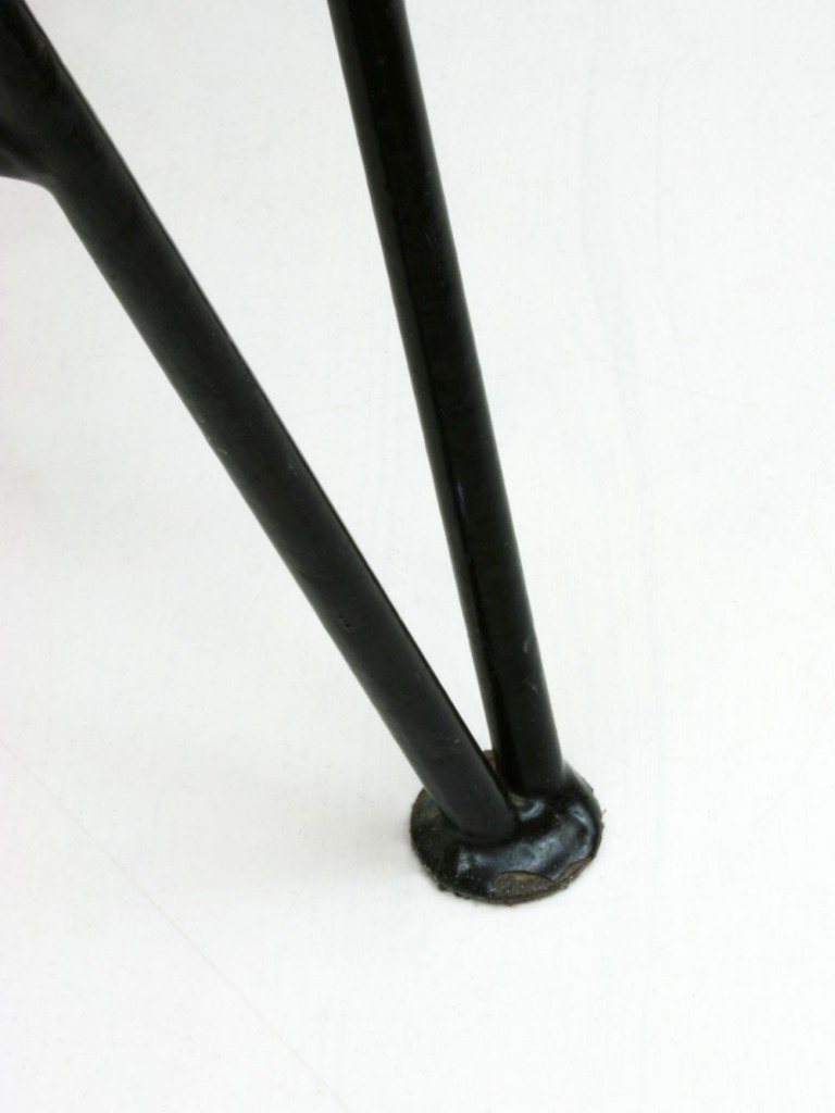 Beautiful set of 2 handwoven wicker lounge chairs with a black lacquered three-legged hairpin metal base.