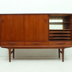 This gorgeous and very rare highboard has 3 sliding doors, 3 drawers and a bar inside. The bar comes with a mirror which has a beautiful sandblasted pattern. It also has beautiful shaped handles and legs.