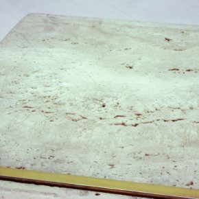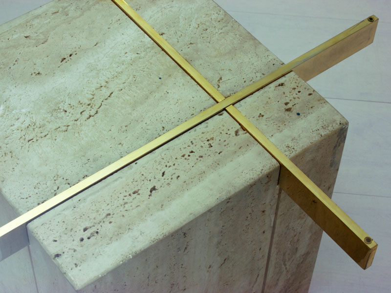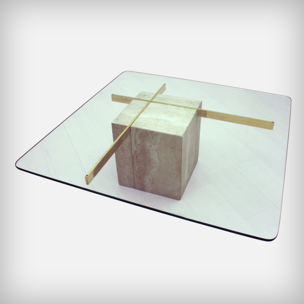 Coffee table with travertine gold-plated cross base and glass tabletop.